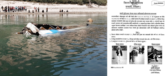 मन्थली नगरपालिका–६, बेनीघाटस्थित तामाकोशी नदीमा भएको बस दुर्घटनाका तीन जना यात्रु अझै बेपत्ता रहेका छन्।जिल्ला प्रहरी कार्यालय रामेछापले उनीहरुको फोटो ...