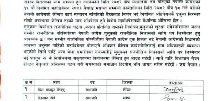विराटनगर । नेपाली कांग्रेसका कोशी प्रदेशका ८ जिल्लाका सभापतिहरूले वर्तमान परिस्थितिमा पार्टीको विशेष महाधिवेशनको कुनै वैधानिक औचित्य नरहेको बताए ...