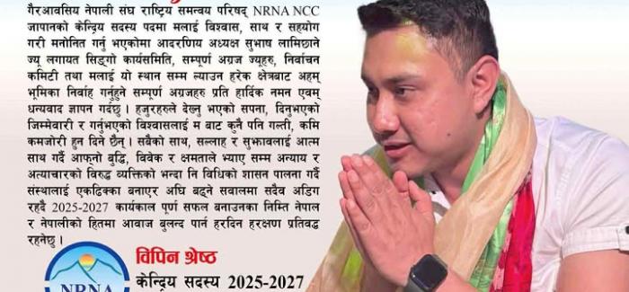 हालै सम्पन्न गैरआवासीय नेपाली सङ्घ (NRNA) राष्ट्रिय समन्वय परिषद्, जापानको निर्वाचनमा केन्द्रीय सदस्य २०२५–२०२७ का लागि बेलबारीका युवा समाजसेवी तथा व् ...