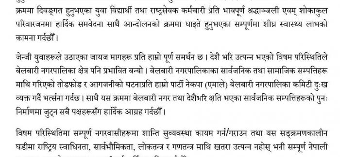 नेपाल कम्युनिष्ट पार्टी (एमाले) बेलबारी नगर कमिटीले जेनजी आन्दोलनका क्रममा ज्यान गुमाएका विद्यार्थी र राष्ट्रसेवक कर्मचारीप्रति श्रद्धाञ्जली अर्पण गरे ...