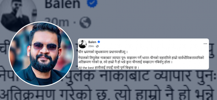 काठमाडौँ महानगरपालिकाका प्रमुख बालेन्द्र शाह (बालेन) ले चीन भ्रमणमा गएका प्रधानमन्त्री केपी शर्मा ओलीलाई लिपुलेक अतिक्रमणबारे कुरा उठाउन आग्रह गरेका छ ...