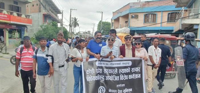 कोसी प्रदेश सरकारले सदनमा पेस गरेको सञ्चार विधेयकको विरोधमा नेपाल प्रेस यूनियनले उल्टो जुलुस निकालेको छ। आइतबार प्रदेशसभानजिकै देवकोटा चोकबाट यूनियनमा ...