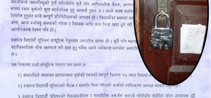 बेलबारी। सुकुना बहुमुखी क्याम्पसमा स्वतन्त्र विद्यार्थी यूनियन (स्ववियु) का अध्यक्ष एलिश ओझामाथि विद्यार्थी कोष दुरुपयोग गरेको आरोप लागेको छ। स्ववियुक ...