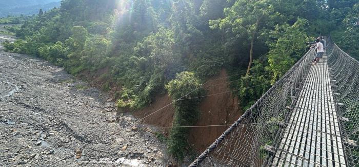 अविरल वर्षासँगै सेउती खोलामा आएको बाढीका कारण धरान उपमहानगरपालिका–१४ को यायोखा टोल र धरान उपमहानगरपालिका–४ को किरात बस्तीलाई जोड्ने झोलुङ्गे पुलको पूर ...