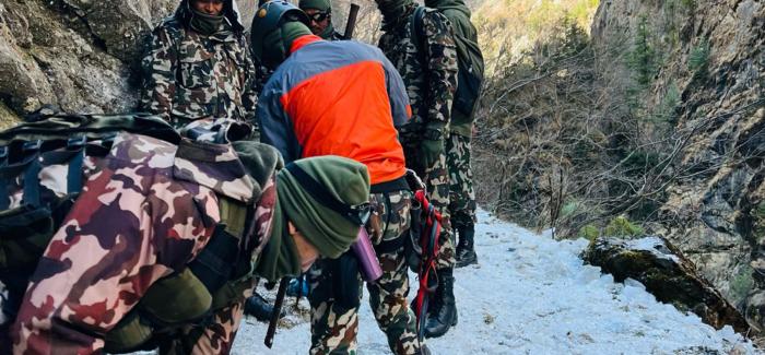 मनाङ चामेमा रहेको इन्द्र दल गुल्मका नेपाली सेनाकोे टोलीले हिउँ र जमेको छहराकोे वरफ काटेर बाटो खुलाउँदैे, हिमपातका कारण नार्पाभूमि गाउँपालिका ...
