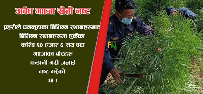 धनकुटा जिल्लाको बिभिन्न स्थानमा अवैधरुपमा लगाएको र प्राकृतिक रुपमा आफै उम्रिएका गाँजाको बोटहरु प्रहरीले फडानी गरी नष्ट गर्दै आईरहेको छ । कोशी प्रदेश प ...