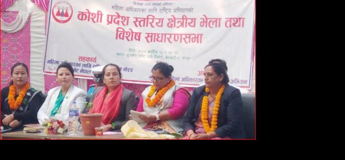 महिला अधिकारका लागी राष्ट्रिय अभियान कोशी प्रदेश स्तरीय क्षेत्रीय भेला तथा विशेष साधारण सभा आज सम्पन्न भएको छ । कार्यक्रम बेलबारी—२ स्थीत सुदर्शन मल्ट ...