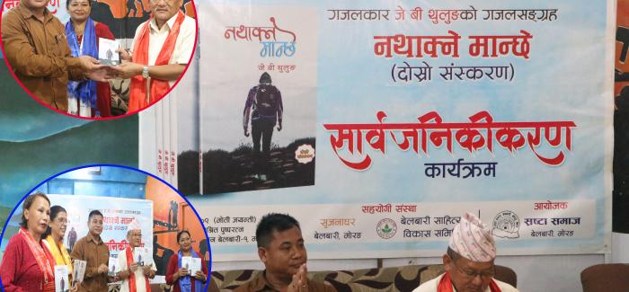 बेलबारी, १२ भाद्र । बेलबारीका कलाकार तथा गजलकार जेवी थुलुङको गजलकृति नथाक्ने मान्छेको दोस्रो संस्करणको लोकार्पण भएको छ । बेलबारीमा आज एक कार्यक्रमकावि ...