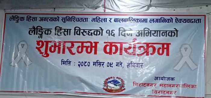 विराटनगर, ९ मंसिर ।लैगिक हिंसिा विरुद्धको १६ दिने अभियानलाई कोठामा मात्र सिमित राखेर भाषण गरेर मात्र सार्थक नहुने भन्दै यसको रुप परिवर्तन गर्नु पर्ने ...