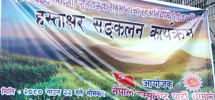 भ्रष्टचार, अनियमितता, देशमा बढ्दो महँगी र सुन तस्करीको बिरुद्वमा नेकपा एमालेले बेलबारी नगर कमिटीको आयोजनामा साँकेतिक रुपमा हस्ताक्षर सँकलन कार्य ...