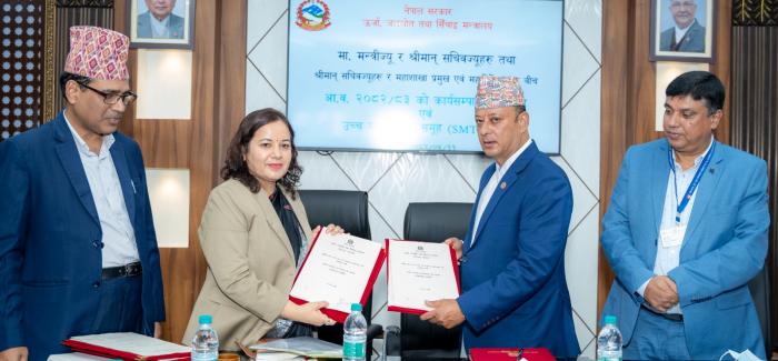 ऊर्जा, जलस्रोत तथा सिँचाइ मन्त्रालयले चालु आर्थिक वर्ष २०८२/८३ का लागि कार्यसम्पादन सम्झौता गरेको छ।मन्त्री दीपक खड्का र मन्त्रालयअन्तर्गतका तीन सचिवब ...